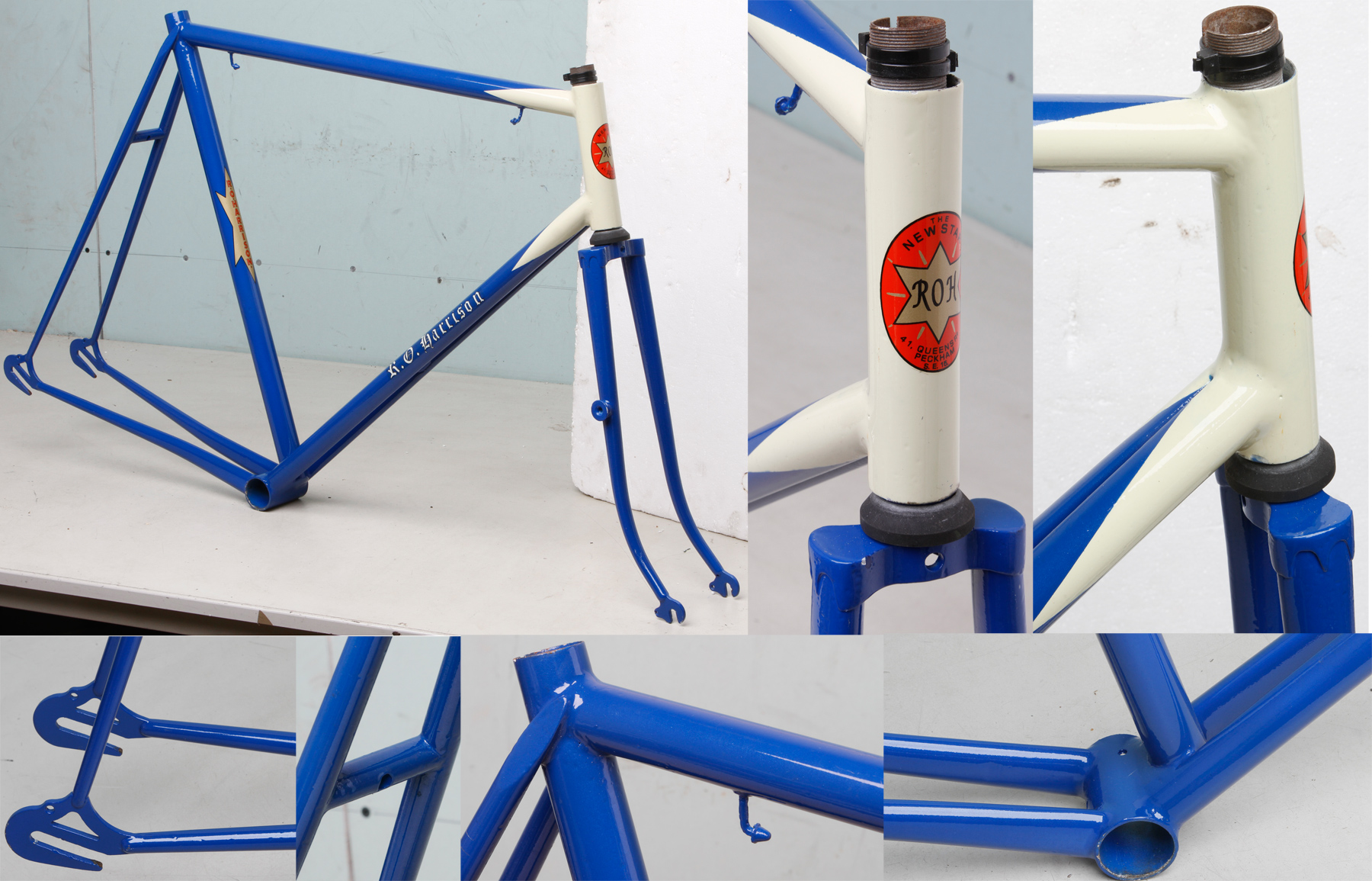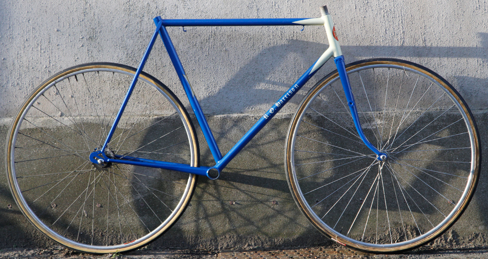 R O Harrison was a south London framebuilder who was one of Maurice Selbach’s framebuilders before he set up on his own around 1933. He had an excellent reputation. More details can be found at http://www.classiclightweights.co.uk/harrison.html R O Harrison frames are very consistent in quality. The Shortwin model was introduced in 1949 – this frame must been one of the first for its dated as being January 1949. It has been repainted in what I would guess to be its original paint style. The paint is a little thick and in places some light pitting shows but I think once built up it would look very good… A really rare and desirable frame – there are only about half a dozen known survivors. £545