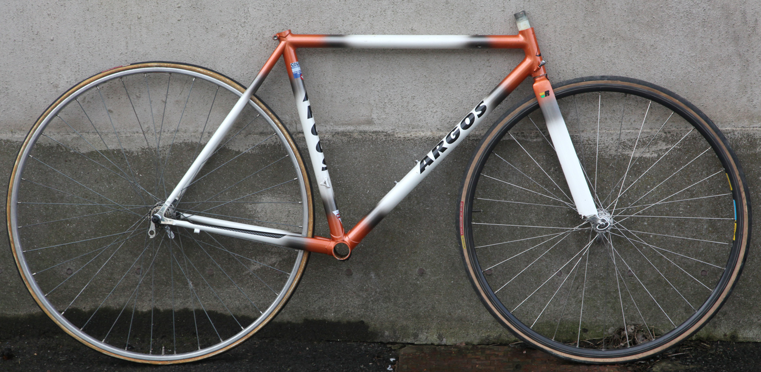Argos Cycles was started in 1974 by Arthur Needham as an adjunct to his engineering business. Frames are now built by Gary Needham, Arthur’s son. They are have enviable reputation for the care and precision with which they build their frames. And over the years they have built many lo-pro and TT frames. This lo-pro frames dates from 2000 is built from Columbus Foco combined with the special Argos aero Reynolds fork blades and Argos’ proprietary stainless steel dropouts. Its in beautiful condition with only a few small marks and shows off their superb workmanship. £295