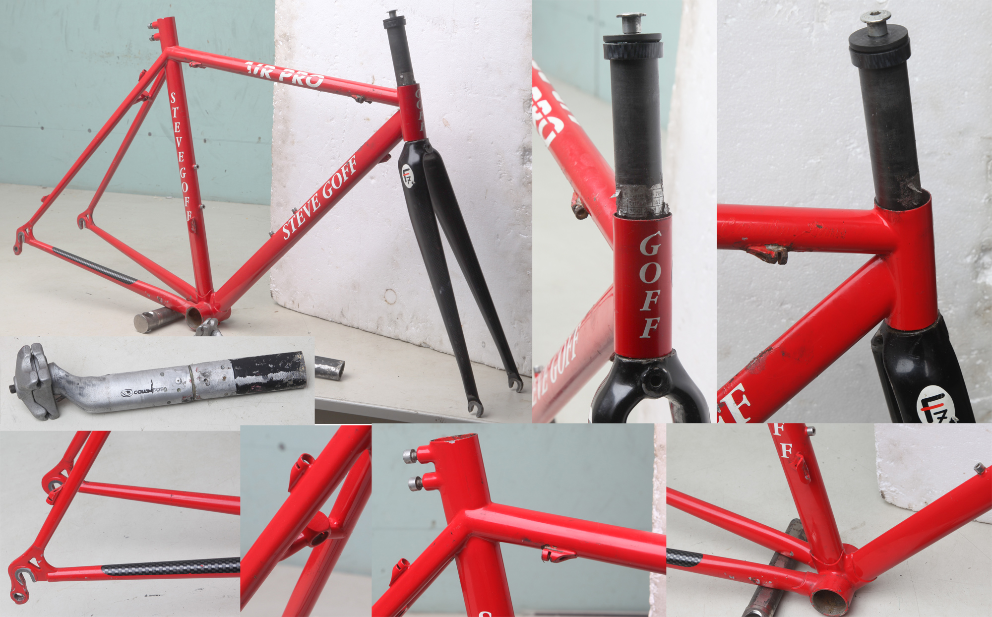 Steve Goff is a small one man framebuilder who these days operates from near Skelmersdale. This is a lo-pro TT frame built from Columbus Air teardrop shaped tubing and has a threadless carbon fork fitted – from the frame number I suspect it was built in 1999… Its in good condition with just some corrosion bubbling around the top tube braze-ons. The Columbus Air seatpost has been cut at some time and then rejoined… Maximum rider inside leg would be about 32in… £185