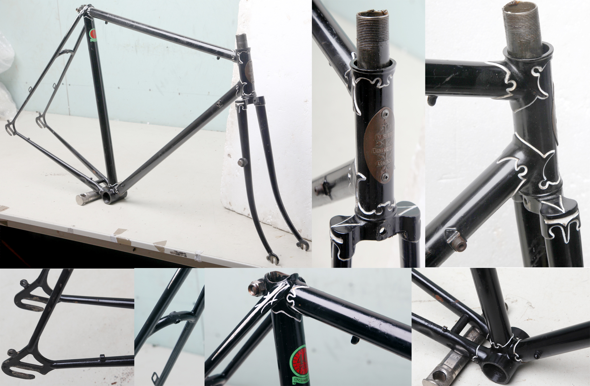 R O Harrison was a south London framebuilder who was one of Maurice Selbach’s framebuilders before he set up on his own around 1933. He had an excellent reputation. More details can be found at http://www.classiclightweights.co.uk/harrison.html R O Harrison frames are very consistent in quality. The Shortwin model was introduced in 1949 – this frame must been one of the first for its dated as being January 1949. It has been repainted in what I would guess to be its original paint style. The paint is a little thick and in places some light pitting shows but I think once built up it would look very good… A really rare and desirable frame – there are only about half a dozen known survivors. £545