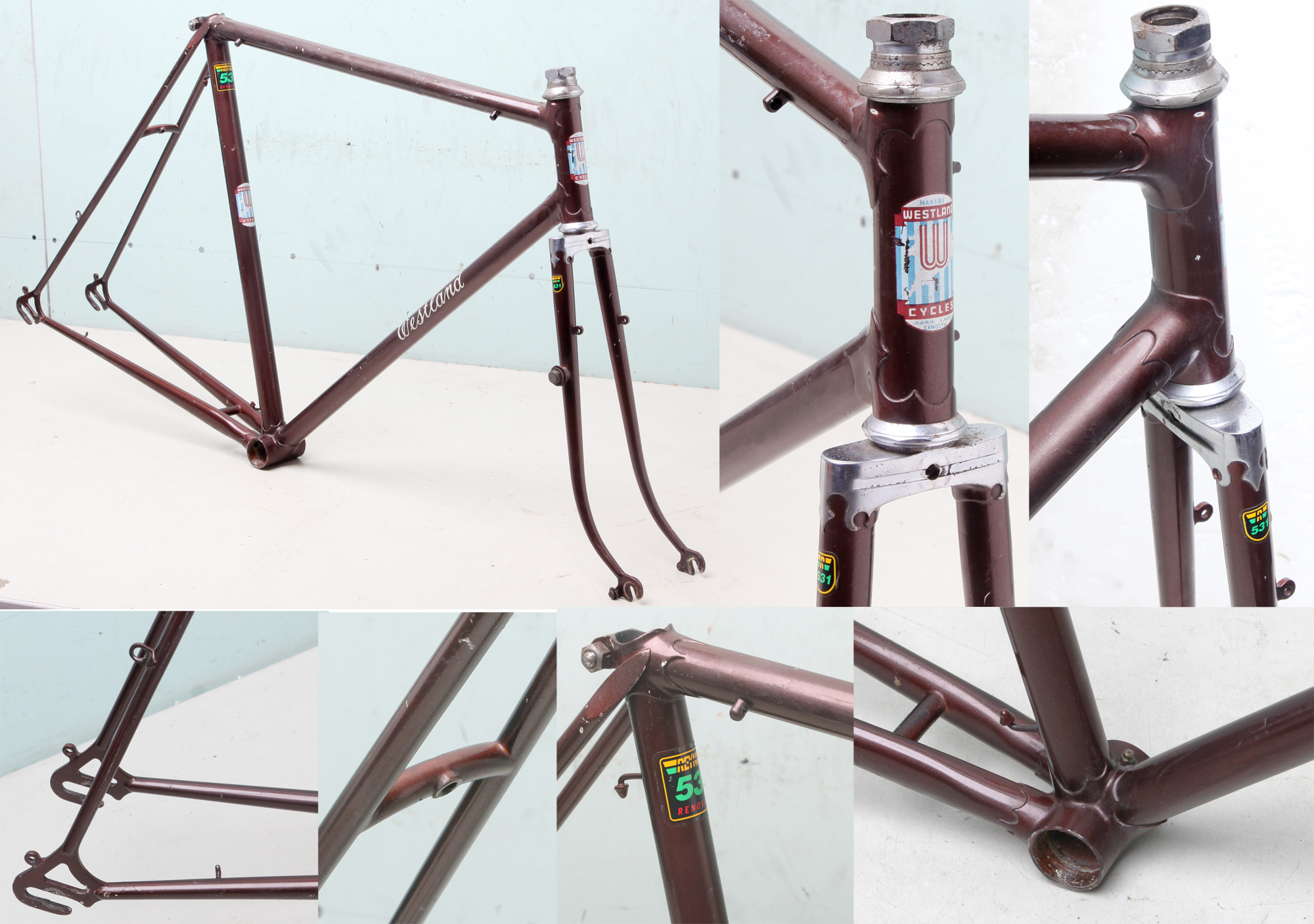 Westland was a small framebuilder in Exeter who also had a shop in Exmouth. The Exeter shop was my local bike shop when I was a kid... They produced small numbers of very well crafted frames between about 1948 and 1960. This frame is in excellent condition – the paint has some marks but nothing too much. £225
