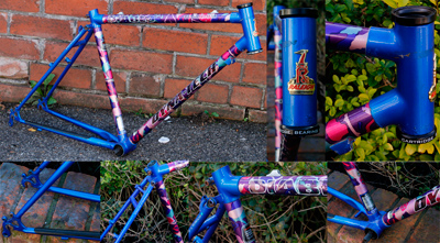This MTB frame dates from c1993 and is built with titanium tubes bonded into aluminium lugs, seatstays and chainstays are steel. These were very nice frames that were both strong and not heavy. It has rear mounts for a rack. There are no forks – it takes forks with a 1 1/8in steerer. SOLD