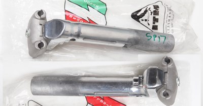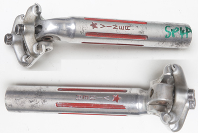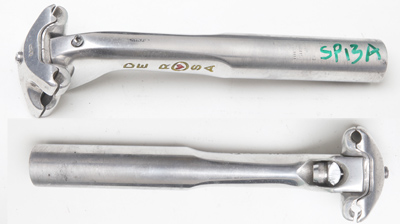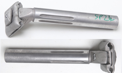 The Campagnolo Record seatpost design was first introduced in 1957 as the Gran Sport and in a thin-walled steel version. When I have any of these they are to be found in Classic Corner seatposts. The aluminium version was introduced around 1959 and was known as the Record. The font is smaller on most seatposts made in the 1960s. The Two-bolt Super Record fluted seatpost was introduced around 1972–3. In about 1977 Campag engraved the seatposts with a limit mark. In 1978 they also introduced the single bolt fluted Super Record seatpost. The two types of Super Record seatpost overlapped in production for a year or two. The classic two-bolt seatpost was also sold as the Gran Sport to go with the Nuovo Gran Sport Group – this was sometimes finished less well than the Record ones but with used posts it almost impossible to identify a Gran Sport seatpost…