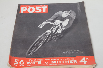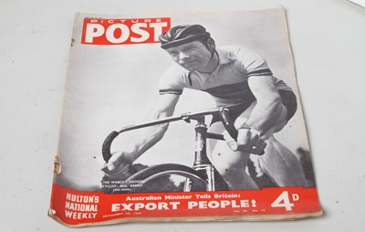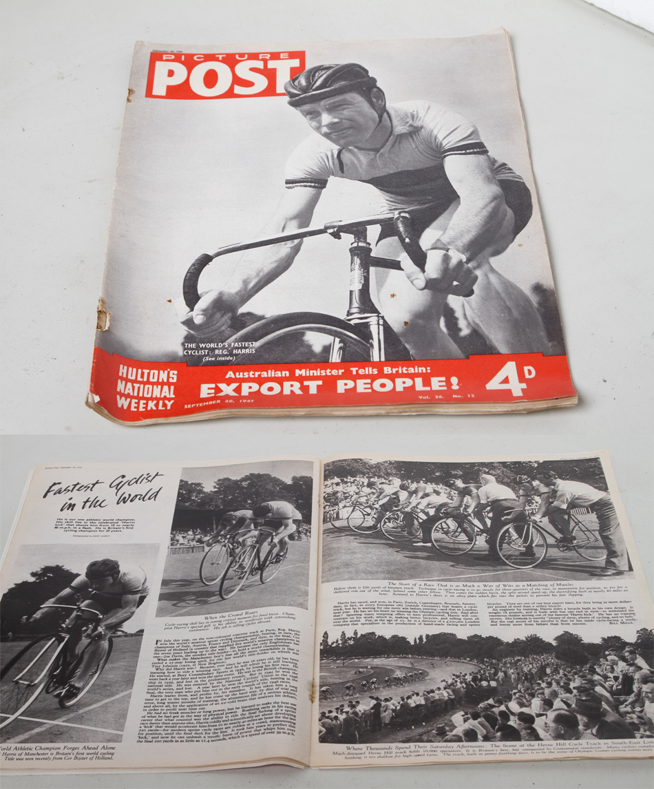 Photos by Bert Hardy, one of the classic photographers of 1950s and 60s on Reg Harris after gaing the Sprint World Championship Two pages on this. £15