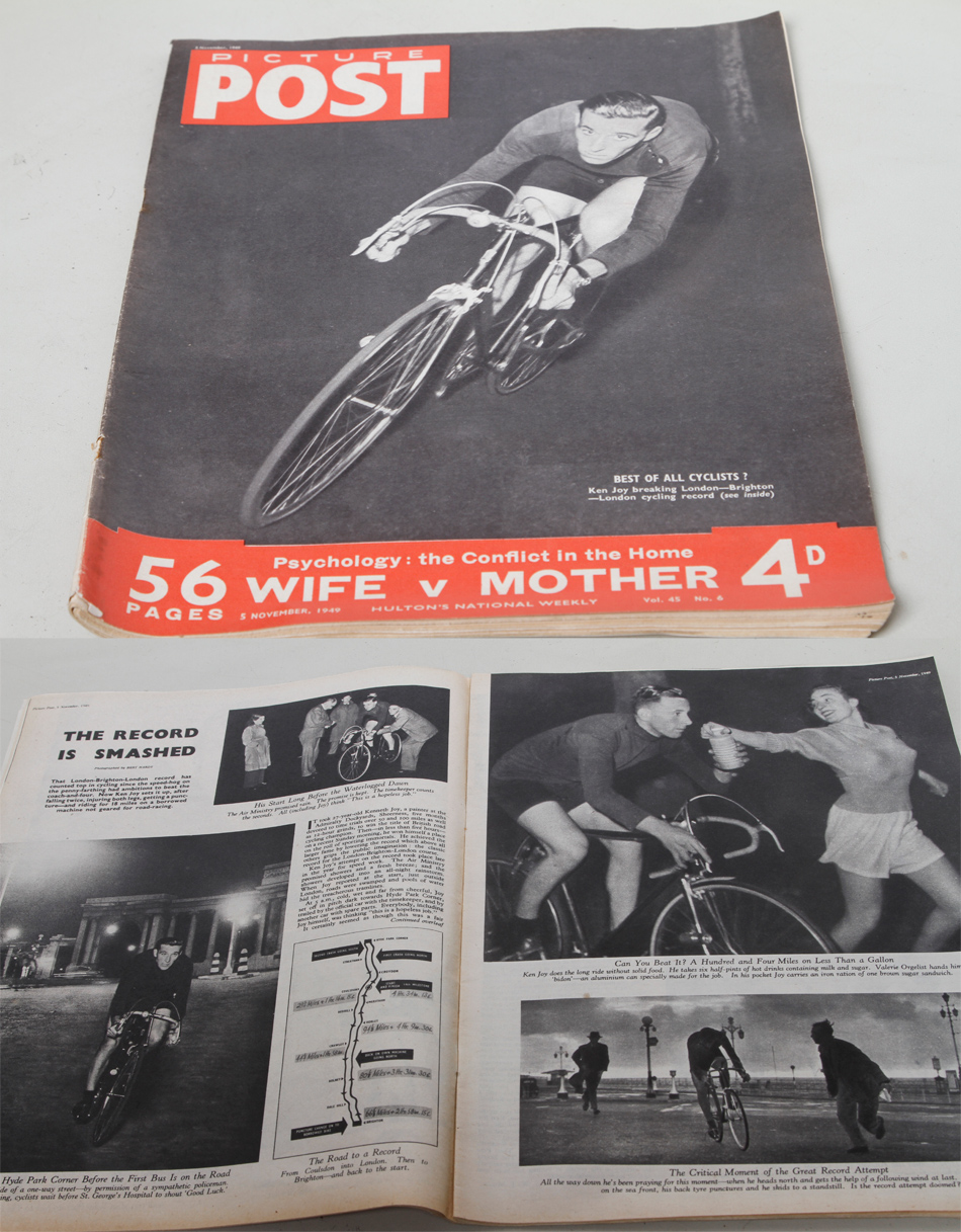 Photos by Bert Hardy, one of the classic photographers of 1950s and 60s covering Ken Joy’s London– Brighton record attempt. Four pages on this. £15
