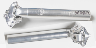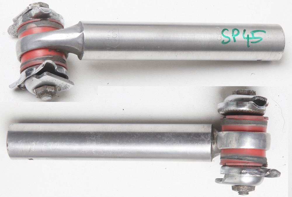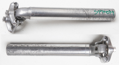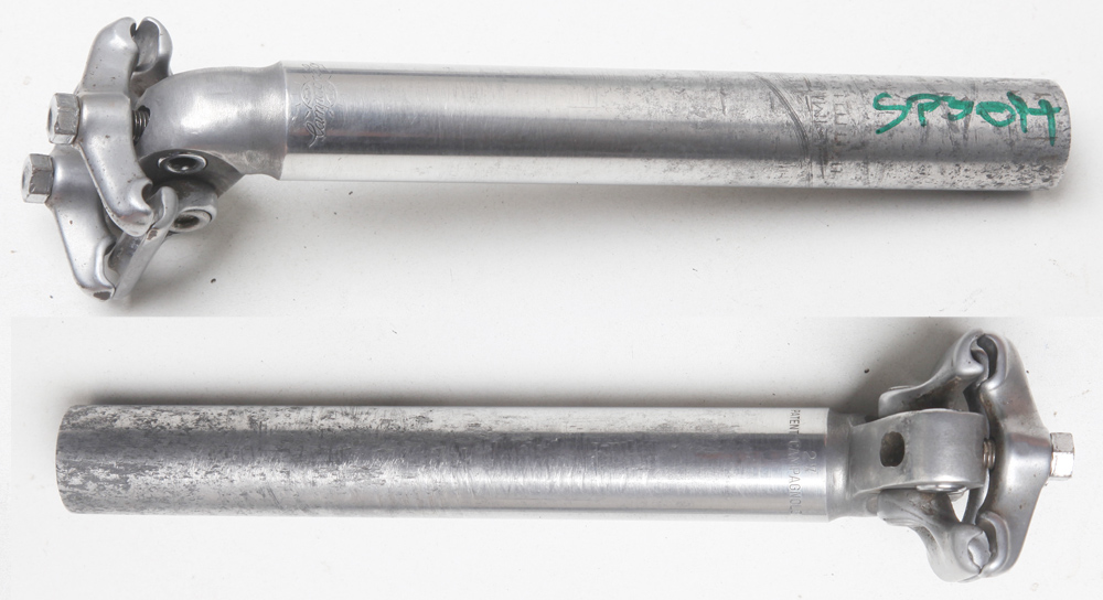 The Campagnolo Record seatpost design was first introduced in 1957 as the Gran Sport and in a thin-walled steel version. When I have any of these they are to be found in Classic Corner seatposts. The aluminium version was introduced around 1959 and was known as the Record. The font is smaller on most seatposts made in the 1960s. The classic two-bolt seatpost was also sold as the Gran Sport to go with the Nuovo Gran Sport Group – this was sometimes finished less well than the Record ones but with used posts it almost impossible to identify a Gran Sport seatpost…